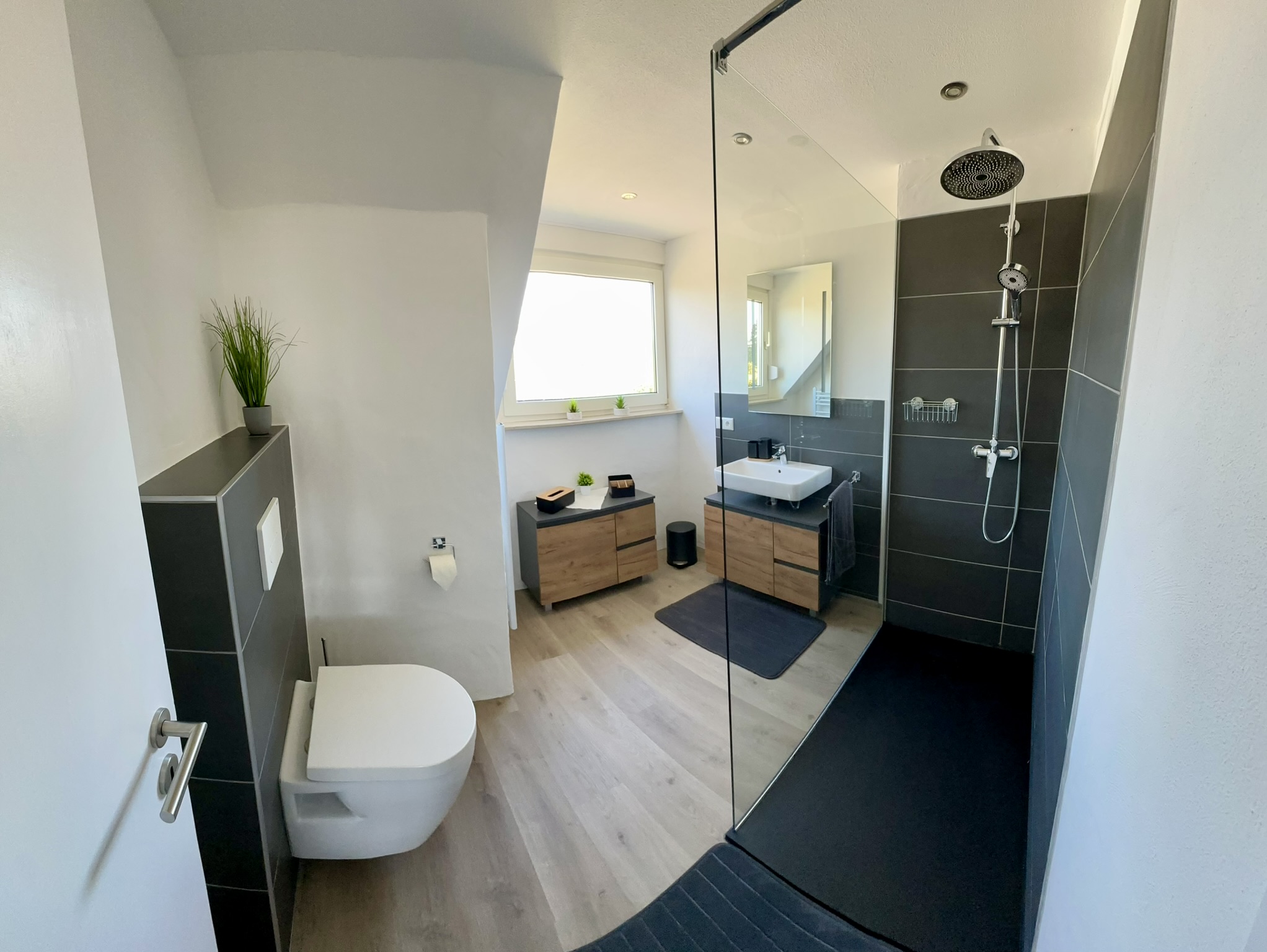 - Badezimmer: Ein modernes Badezimmer mit Dusche, WC und Waschbecken. Zusätzlich bieten wir einen Haartrockner und Pflegeprodukte für Ihren Komfort an.